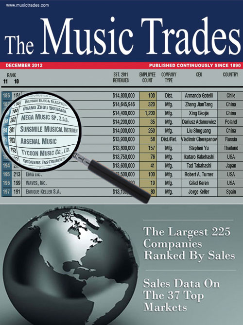 In the December Issue of 2012 Music Trade Show Magazine, Sunsmile ranked 190th in The Global 225 Report. The Global 225 Report, sales rankings of the World's Largest Top 225 manufacturers, is an effort to help distributors and retailers better understand the dynamics of the international industry.